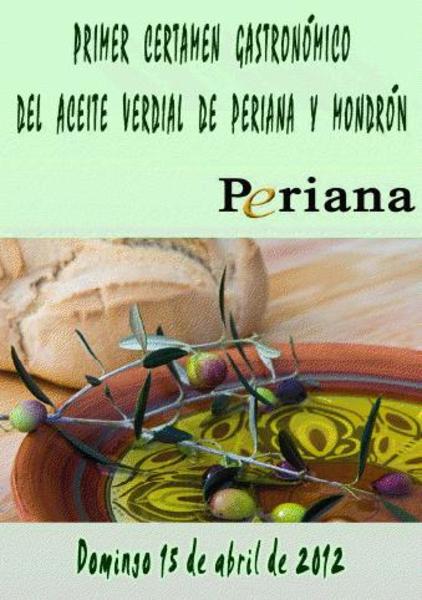 I. DENOMINACIÓN Y OBJETIVOS.-Las Cooperativas Aceiteras y Fruteras San Isidro Labrador de Periana y San José Artesano de Mondrón (Periana) en colaboración con el Ayuntamiento, organizan el Primer Concurso de Cocina cuyo ingrediente principal sea el Aceite de Oliva Verdial. Es objetivo principal del Certamen difundir las virtudes del Aceite Verdial mediante la elaboración de platos.