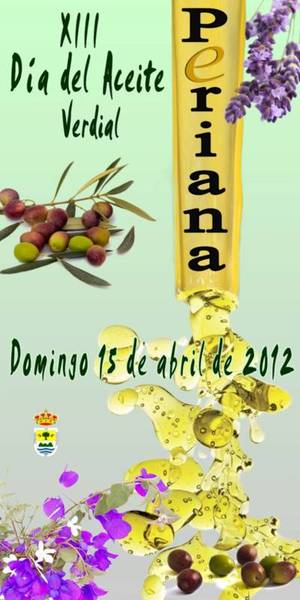 El Domingo día 15 de Abril de 2012, tendrá lugar la XIII edición del Día del Aceite Verdial en el municipio de Periana. La jornada, declarada Fiesta de Interés Turístico Provincial, tiene como principal objetivo dar a conocer el “oro líquido” que se extrae del olivo verdial, una clase de árbol que produce una singular aceituna de la que sale un producto de color dorado y sabor dulce, único y original. Esta singularidad de esta aceituna ya fue apreciada por fenicios y romanos y en los tiempos del reino nazarí.